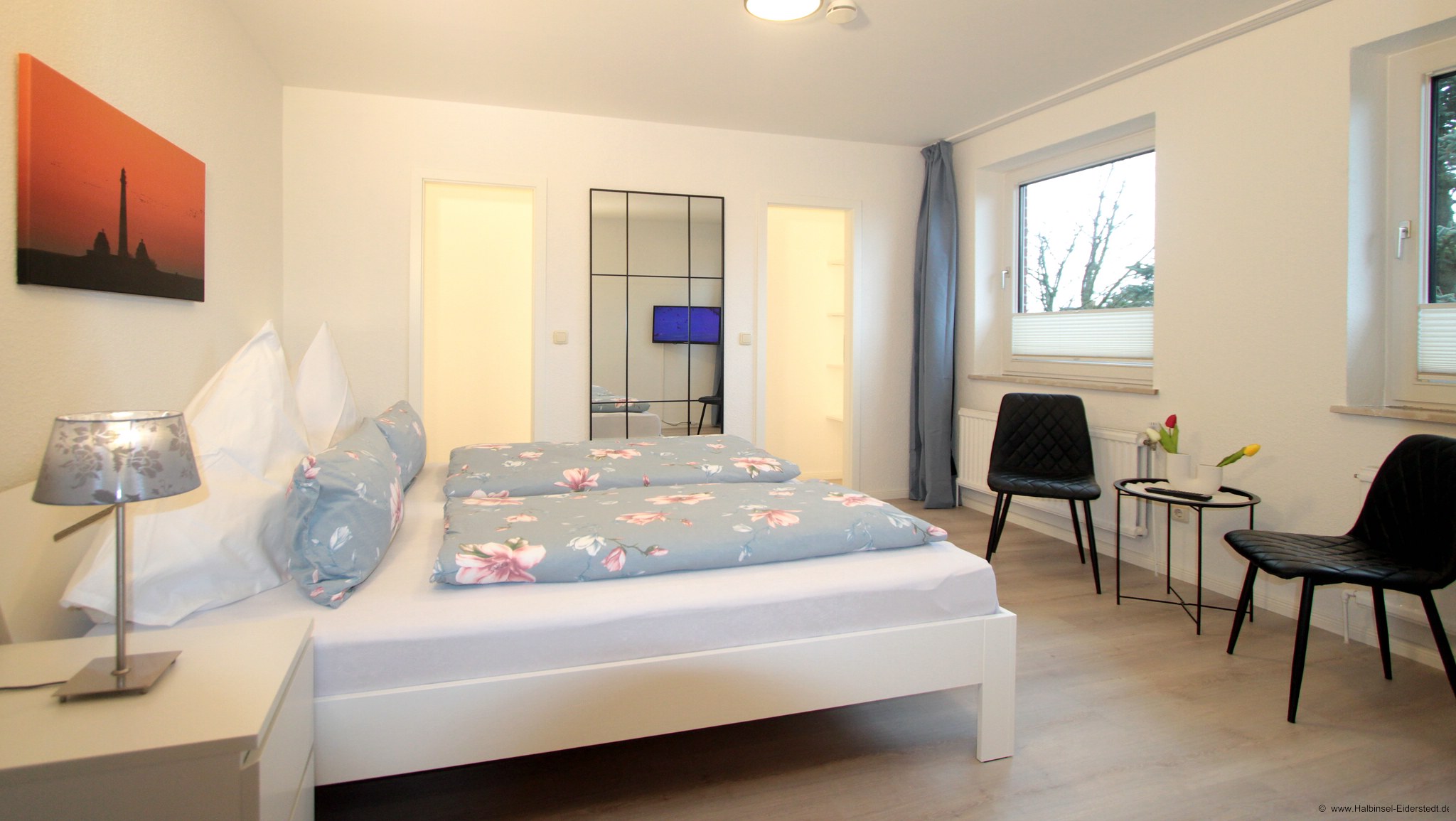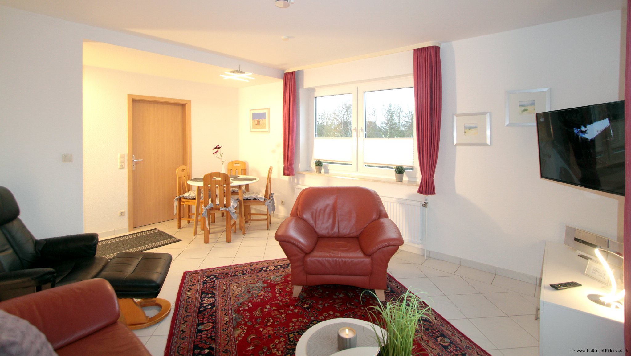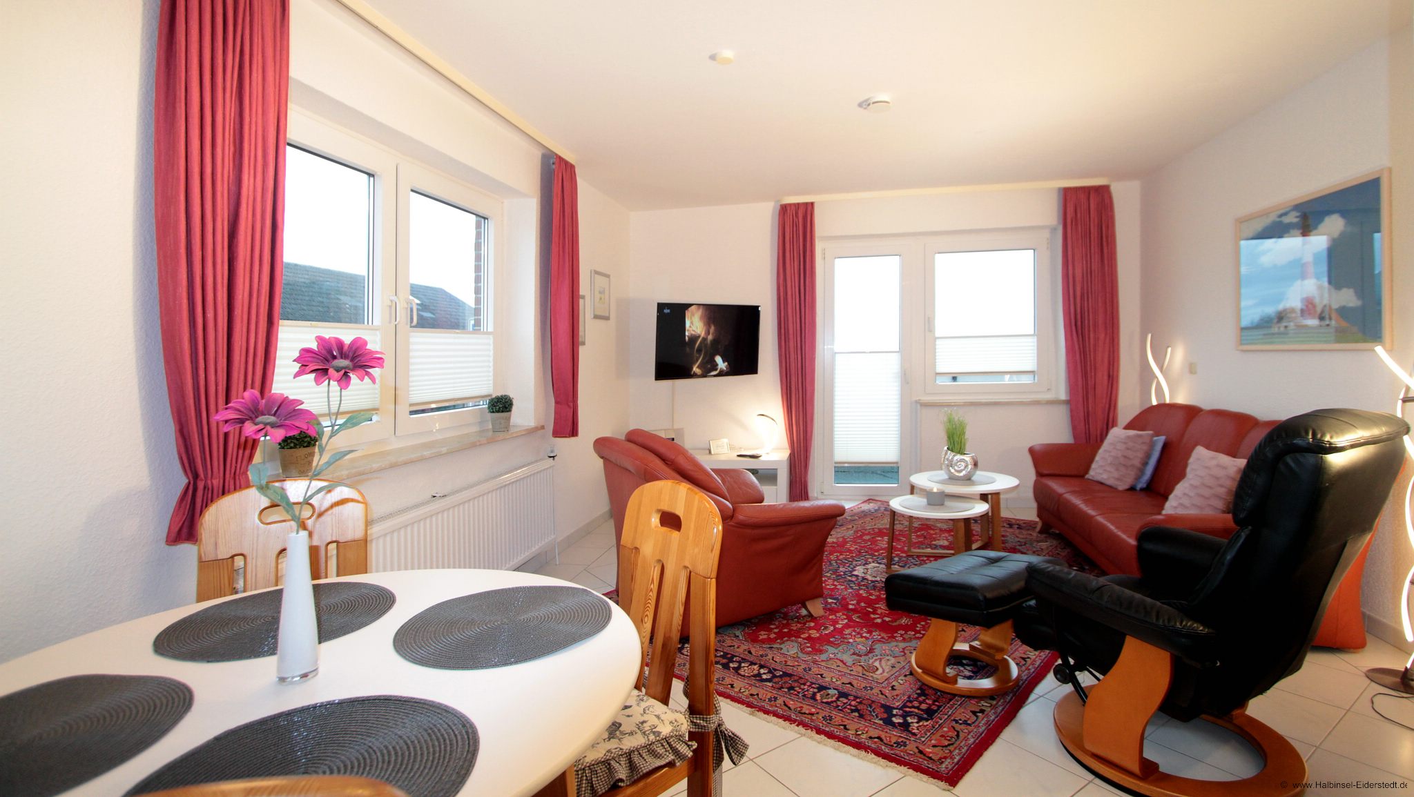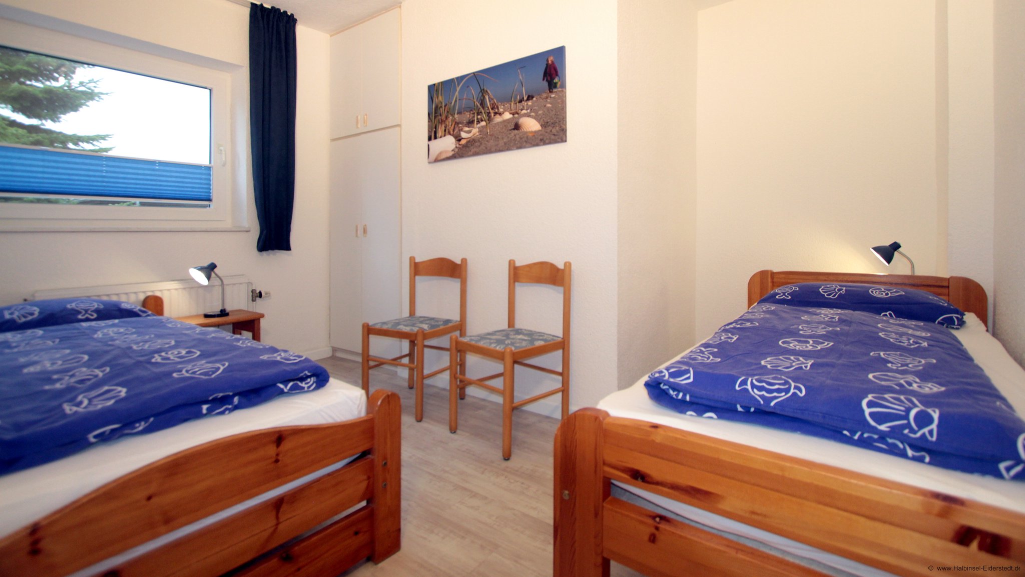 Helle, zur Südseite gelegene, 2-Zimmer-Wohnung im 1. Stock mit Blick über den Seedeich. Wohn-Schlafraum mit Schrankdoppelbetten, Schlafraum mit Einzelbett. Küchenzeile, Sat-TV und Radio, Bad mit Dusche und WC. Balkon zur Südseite. WLAN